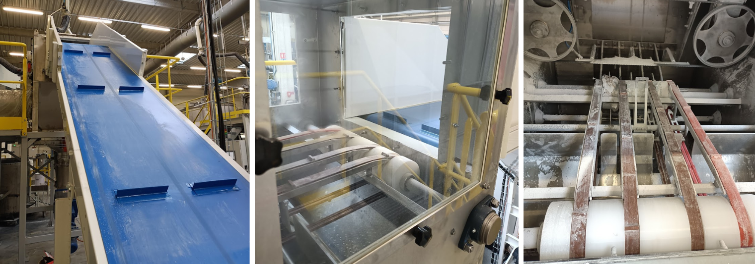 A eficácia desta linha automatizada baseia-se na combinação de equipamentos industriais de alto desempenho, especialmente projetados para o processamento de pós químicos. Cada componente desempenha um papel-chave na otimização do processo de esvaziamento de sacos e acondicionamento: transporte, abertura de sacos, descontaminação de poeira, enchimento e segurança.